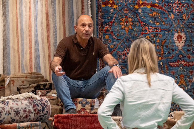 Clients begin by talking through size and space, then gradually narrow options based on style, color, and budget. From there, one of Kismet's expert staff members will pull rugs from stacked collections—sometimes dozens at a time—laying them out, comparing details, and discussing construction, origin, and design.