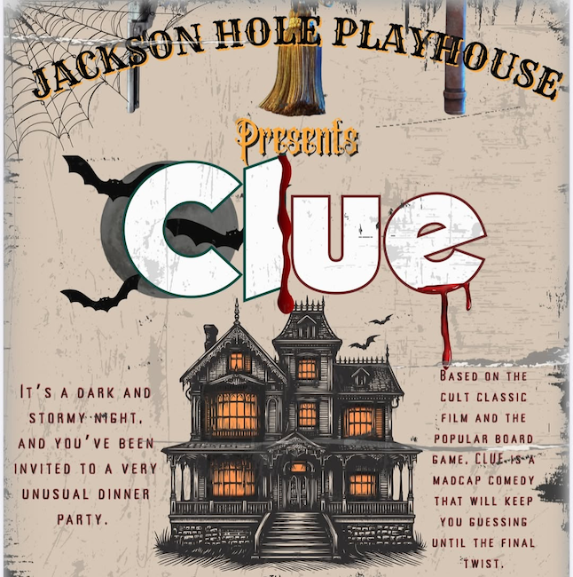 From October 9 through November 1, the historic Jackson Hole Playhouse transforms into the ultimate murder-mystery mansion with Clue: On Stage. All the familiar suspects — Scarlet, Colonel Mustard, Professor Plum, and more — come together for a hilarious, fast-paced whodunit where the only thing certain is laughter (and a little mayhem).